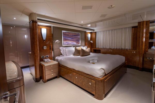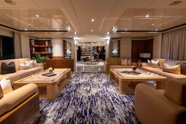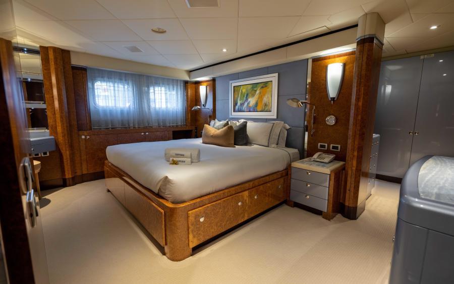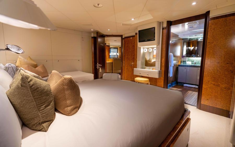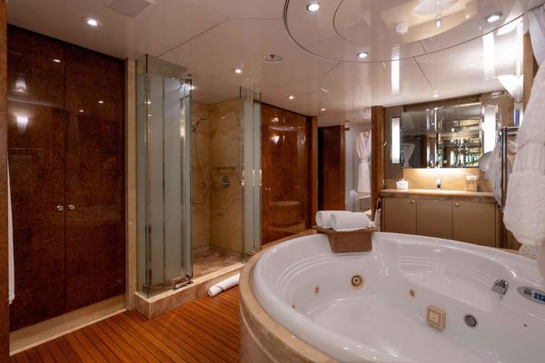 The Owner’s cabin is situated aft on the upper deck. This is truly a magic area with a 180-degree panoramic view from ceiling to floor windows, an outside private deck with ample seating and dining area. The Owner’s cabin is enormous with stunning views, an en suite that has to be seen to be believed, from the huge circular honey onyx Jacuzzi bath to the private study, shower, two heads and two comfortable couches, this is a very striking and private Owner’s area.